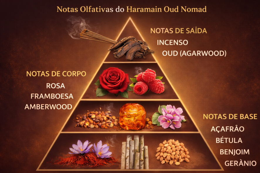 Haramain Oud Nomad abre com uma combinação marcante de incenso e oud (agarwood), criando de imediato uma atmosfera intensa, rica e levemente esfumaçada. No coração, a fragrância ganha novas camadas com a elegância da rosa, o toque frutado da framboesa e a profundidade envolvente do oud, trazendo equilíbrio e sofisticação à composição.