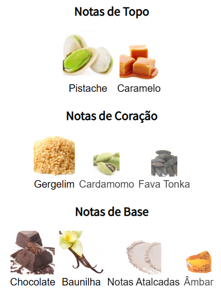 Notas de base: Chocolate, Âmbar, Baunilha, Atalcado