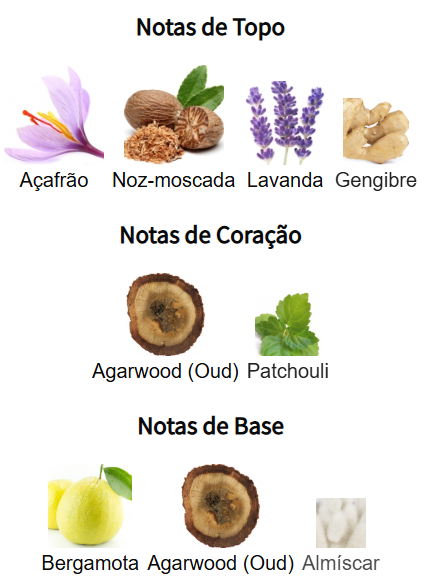 Notas de topo: gengibre, açafrão, noz-moscada, lavanda