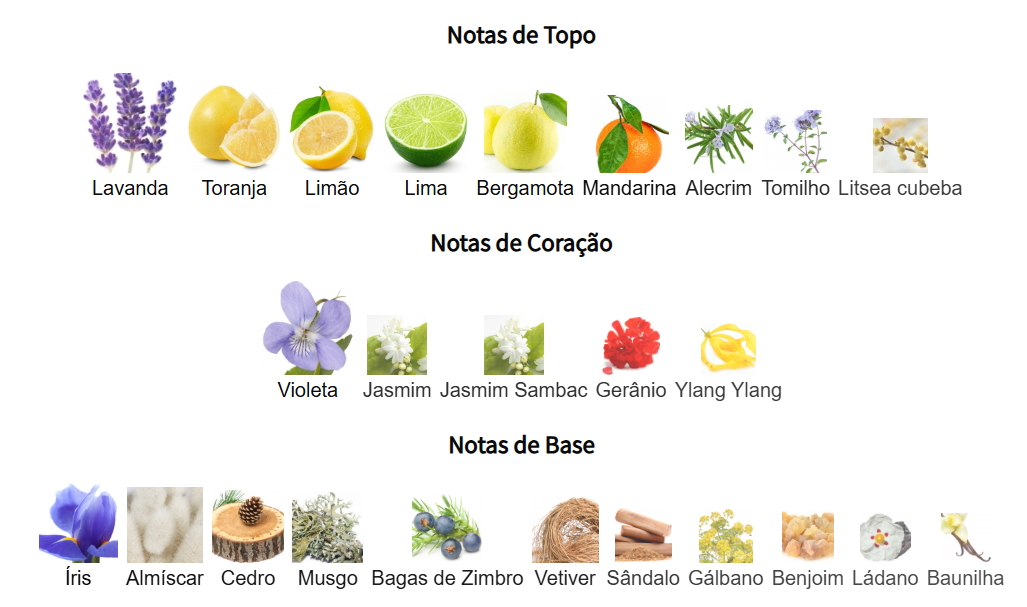 Coração: violeta, gerânio, jasmim e ylang-ylang.