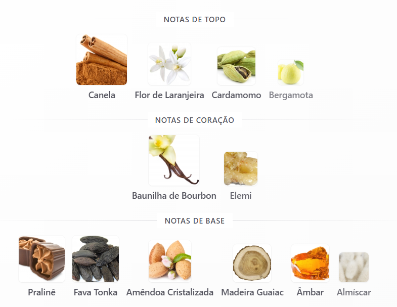 Esta fragrância abre com o calor ousado da canela e do cardamomo, realçado pelo brilho cítrico e pela elegância da flor de laranjeira. No coração, a baunilha e as resinas desdobram-se numa doçura aveludada, delicada, mas perigosamente viciante. A base revela almíscar, âmbar e madeira guaiac, deixando um rastro magnético e refinado.