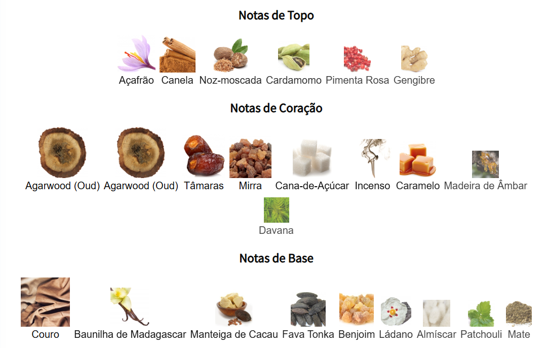 Na abertura, um acorde vibrante de especiarias — açafrão, cardamomo, gengibre, noz-moscada e canela — cria uma explosão quente e acolhedora. Em seguida, as notas de coração trazem profundidade com o caráter inconfundível do oud, que confere sofisticação e magnetismo.