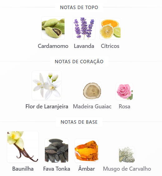 Notas de topo: Cítricos, Cardamomo e Lavanda.