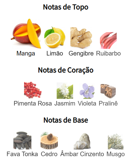 Coração: Pimenta Rosa, Jasmim, Violeta, Pralinê
