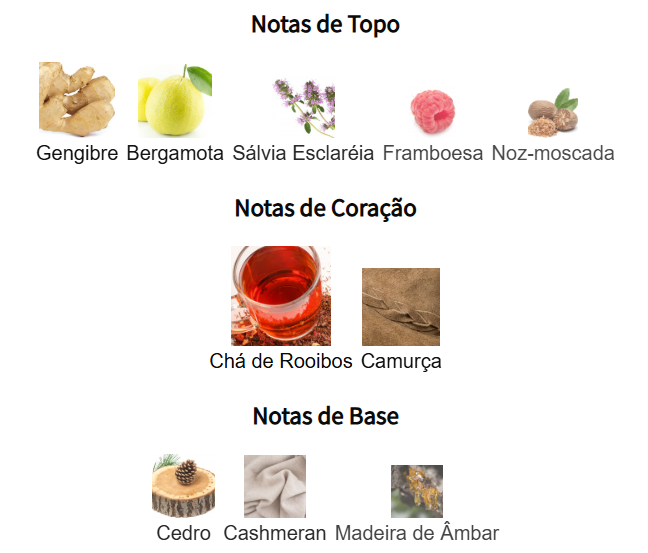As notas de topo são: Gengibre, Bergamota, Sálvia Esclaréia, Framboesa e Noz-moscada.