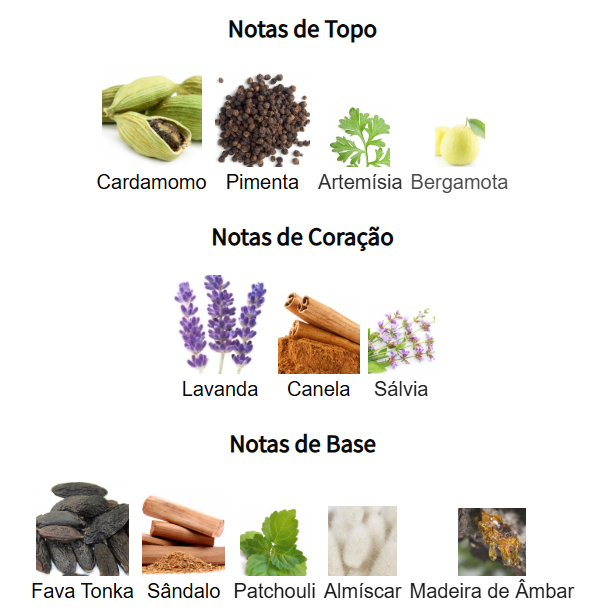 Abre com uma mistura dinâmica de cardamomo, pimenta, artemísia e bergamota, criando uma introdução cítrica e picante que é ao mesmo tempo fresca e revigorante. O coração se revela com sálvia aromática, lavanda calmante e um toque quente de canela, adicionando profundidade e complexidade. À medida que a fragrância se instala, uma base rica de sândalo, patchouli, fava tonka, madeira de âmbar e almíscar proporciona um calor suave e terroso que perdura com elegância.