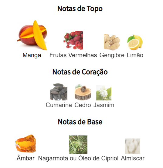 Notas de saída: Manga, gengibre, limão, frutos vermelhos/bagas