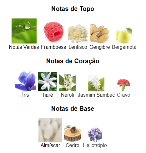 Notas de Corpo: Neroli, Iris, Carnation, Flor de Tiaré, Jasmim Sambac