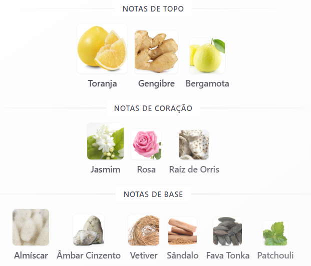 - Notas de topo: Toranja, Gengibre, Bergamota