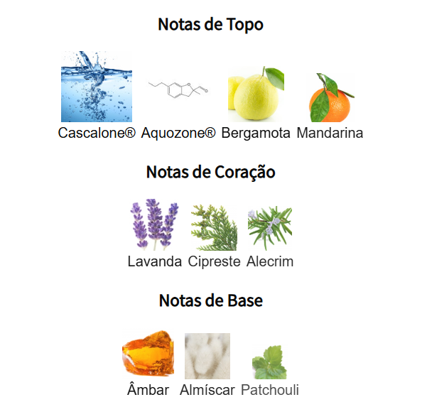 O aroma da tangerina verde adiciona um toque de frescor, a aquazone (elemento água) e o âmbar (mineral) complementam a composição com uma nota de requinte e elegância. Ocean Rush é um perfume para homens determinados e indomáveis, prontos para tudo para alcançar os seus objetivos.